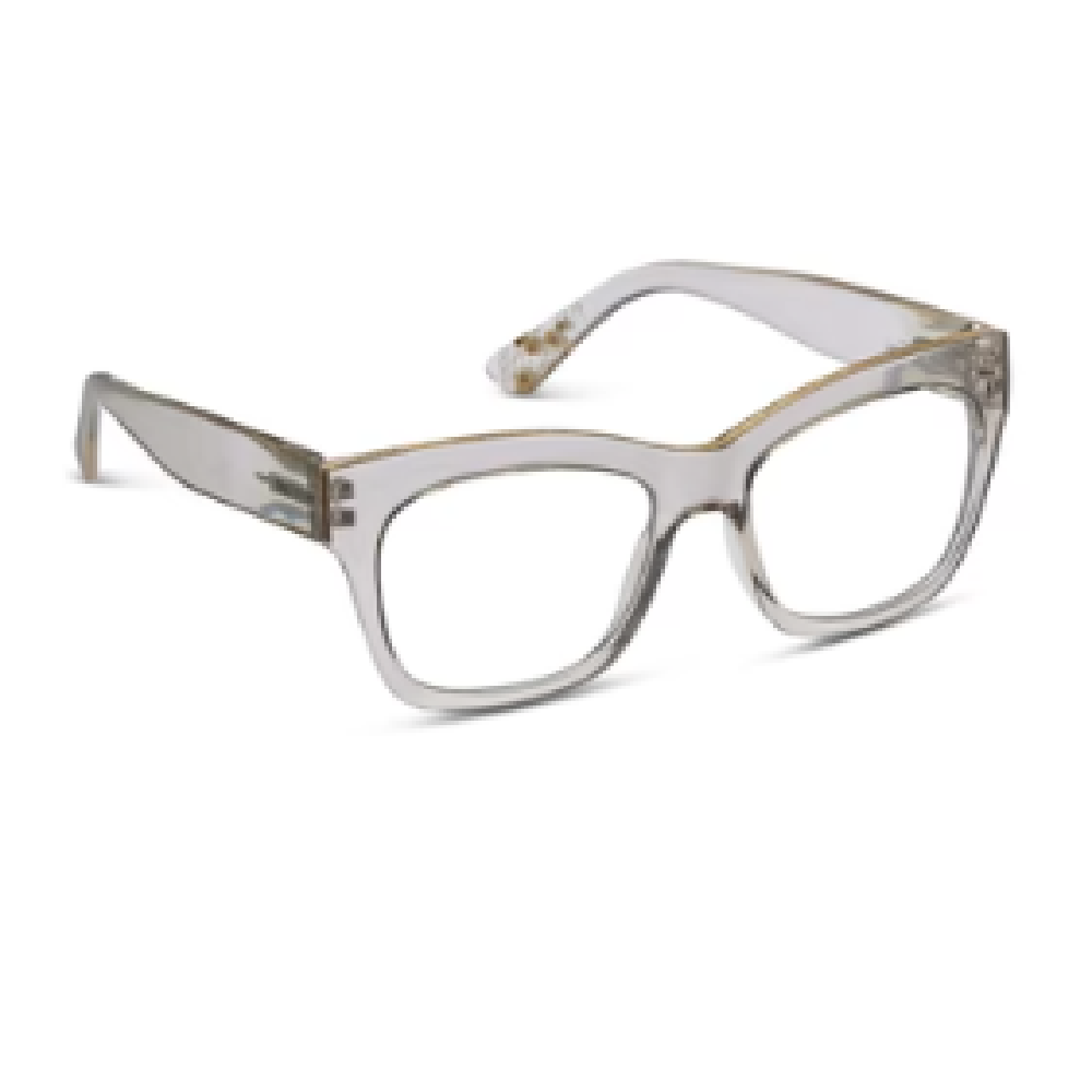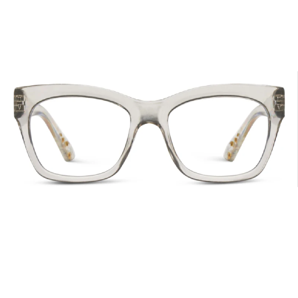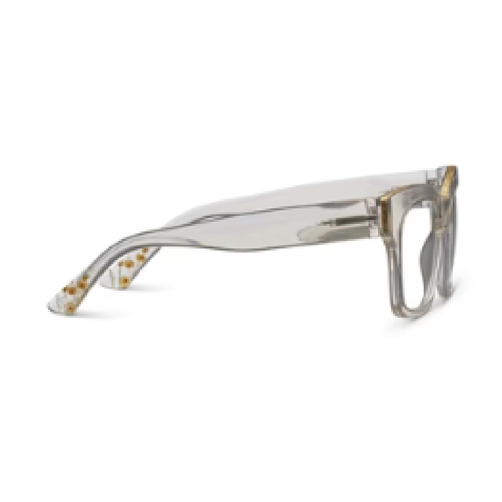 Soulful Style. Marigold elevates a neutral classic to a free-spirited statement piece. The soft square frame offers a flattering shape enhanced by a gold accent across the top. A subtle flower feature carefully embedded in the temple creates an unexpected feminine touch.