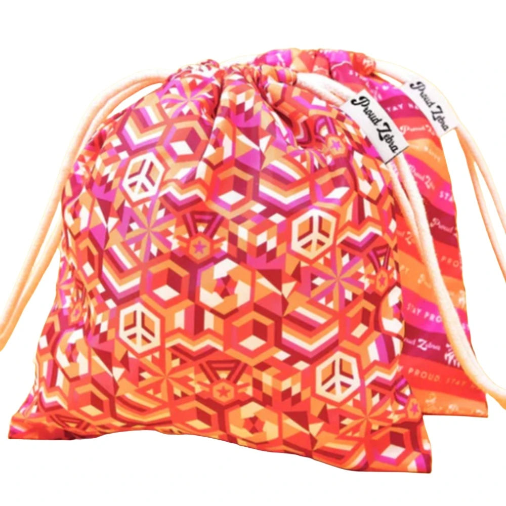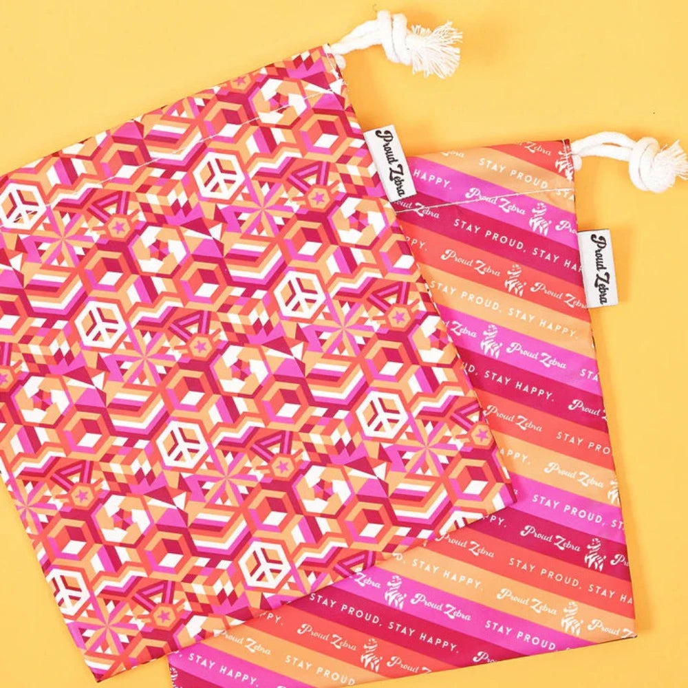 Includes two 7.5x8.3" polyester bags. One with a lesbian pride cube pattern, and one with lesbian pride zebra stripes.