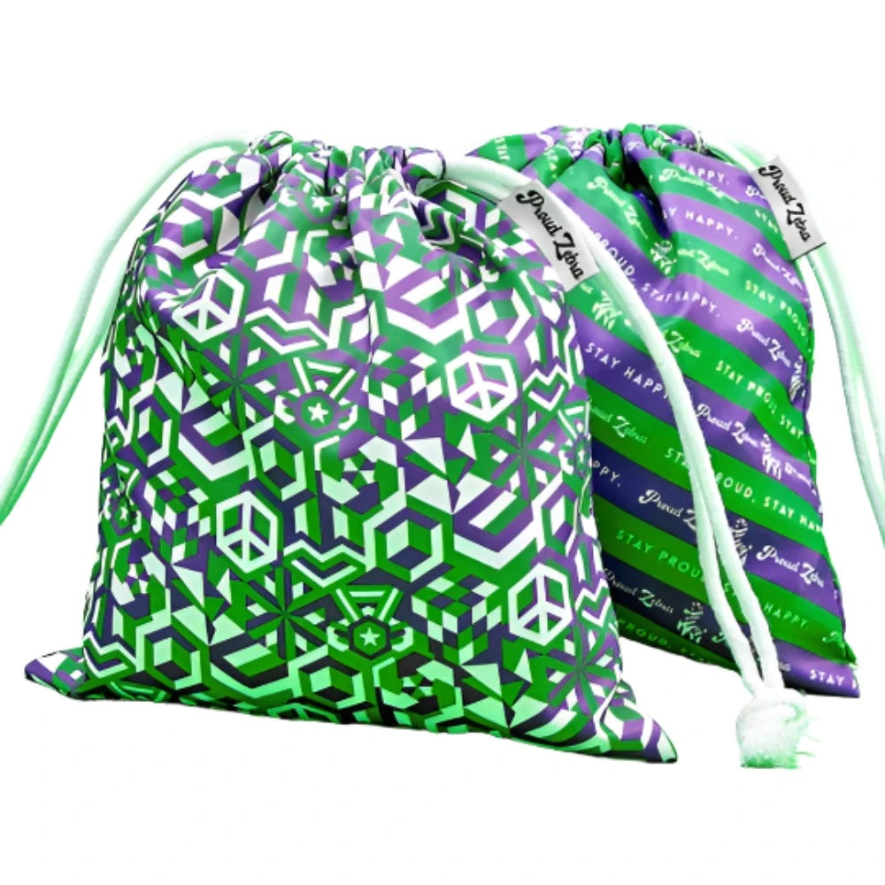 Includes two 7.5x8.3" polyester bags. One with a genderqueer pride cube pattern, and one with genderqueer pride zebra stripes.