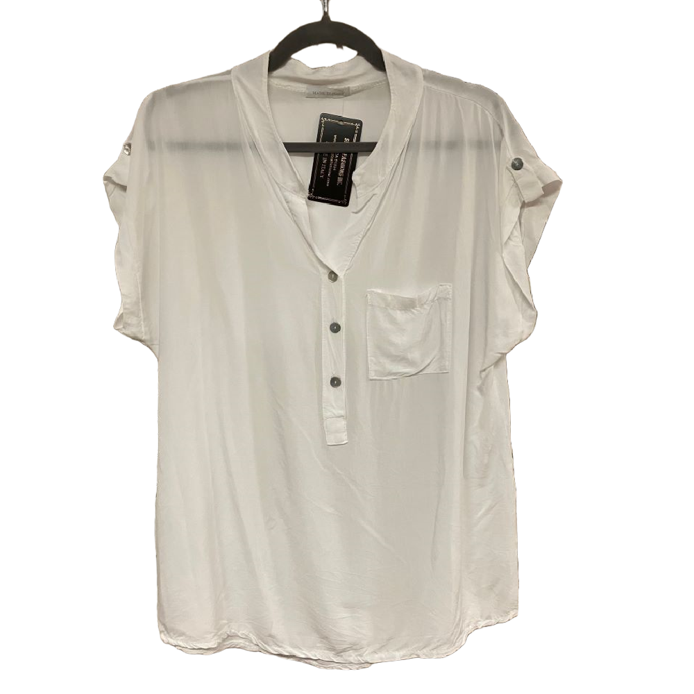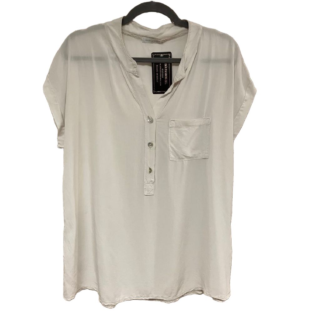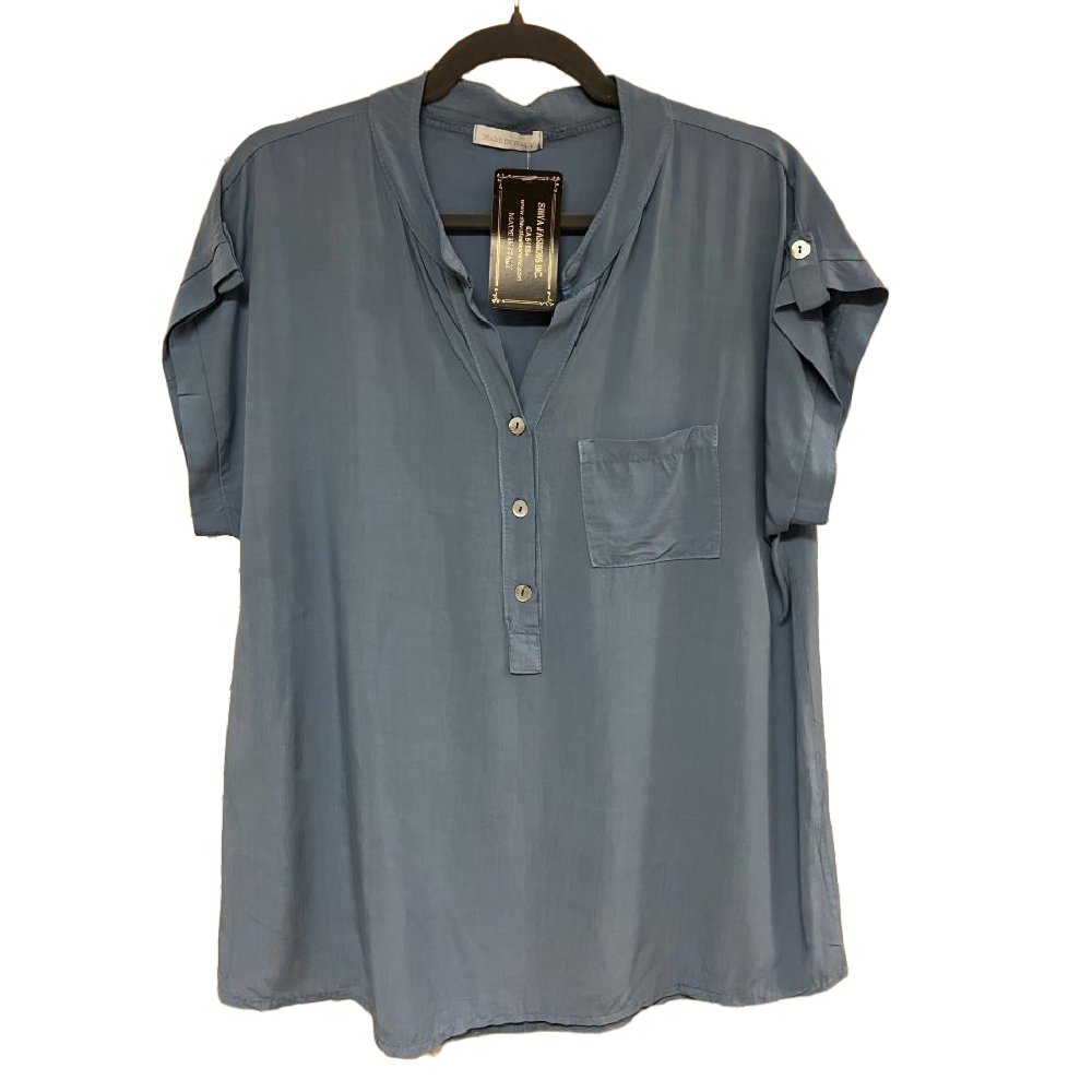 Lightweight hip length viscose top, with collar, 3 button accent, and breast pocket.