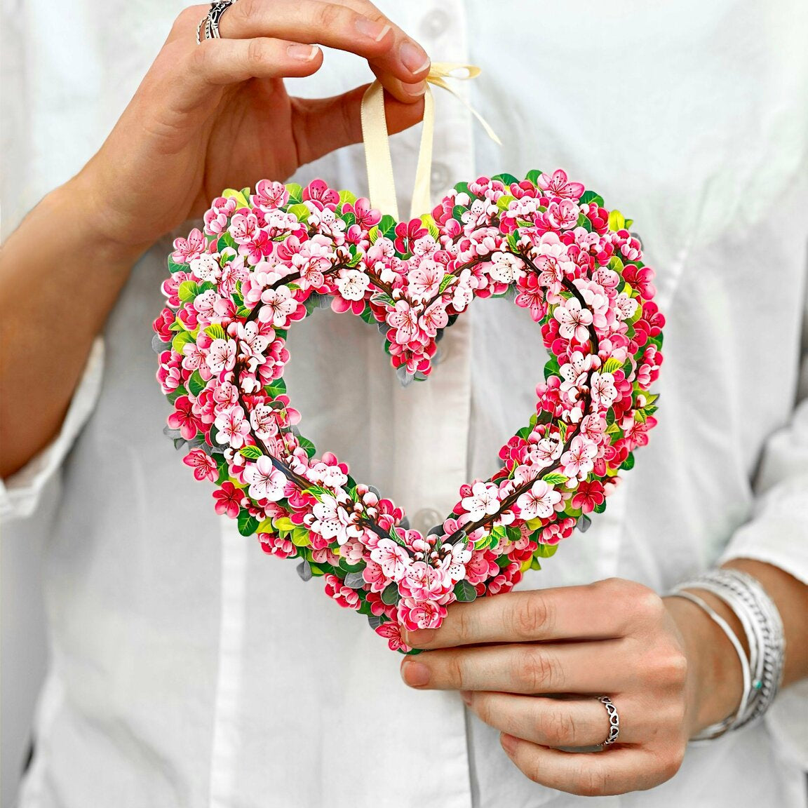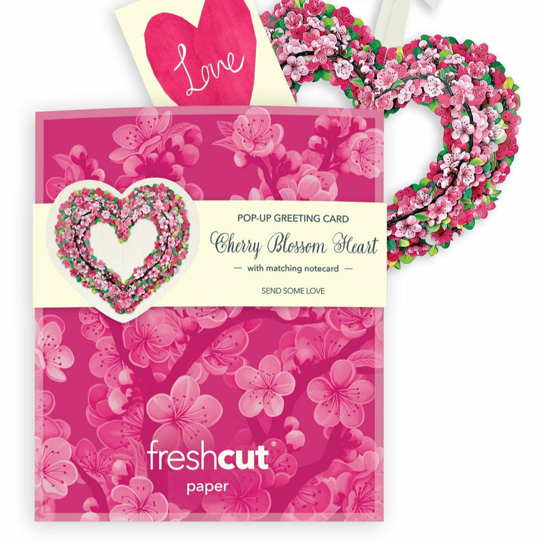 Welcome the season with FreshCut Paper's sculptural mini pop-up Cherry Blossom Heart! This sweet mini pop-up heart features soft pink sakura petals represent renewal and the wondrous beauty of nature. Unlike in the wild, this charming display will remain in bloom year round. Our foldable design can be placed back in the envelope to use for seasons to come! Each heart comes with a blank, 2.5" x 3.5" notecard.