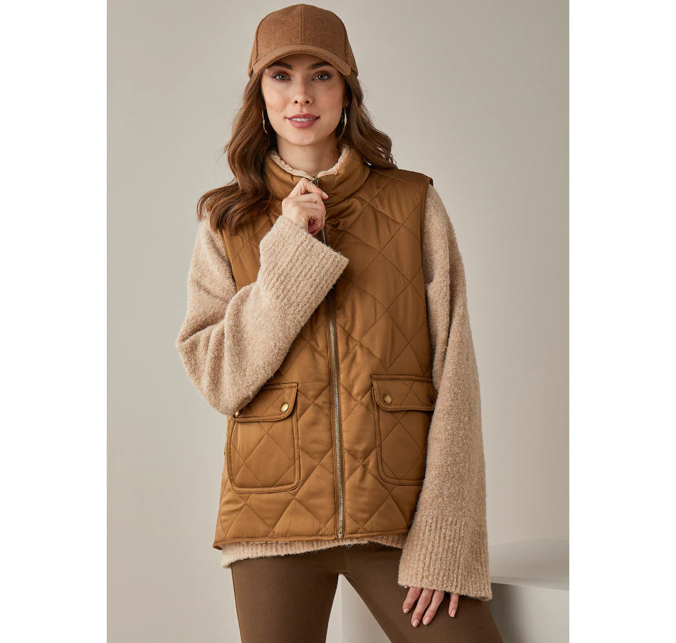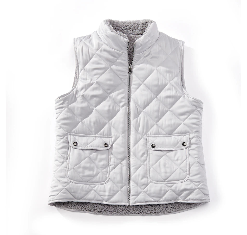 This lightweight reversible quilted zip front vest features patch pockets. It is lined with a soft brushed Sherpa in straight classic lines, and all in an easy fit hip length silhouette. This versatile piece can be worn more ways than one.